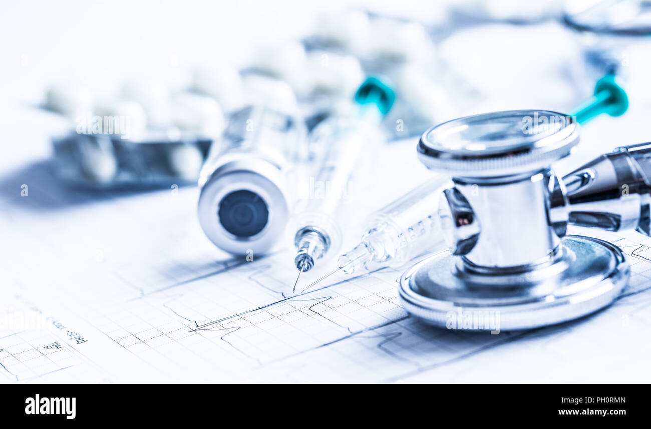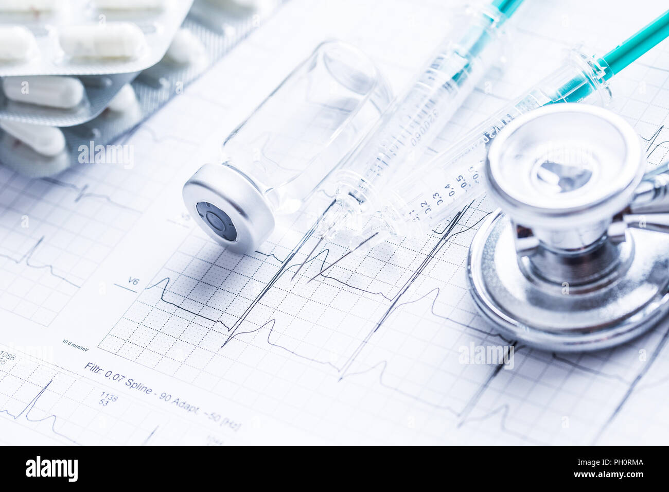 Stethoscope Injections Pills On The Ekg Graph Elektrokardiogram Stock Photo Picture And Royalty Free Image Image 107198056