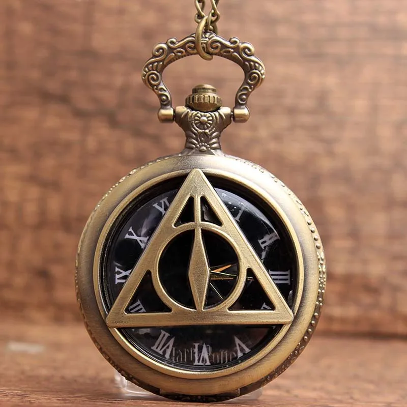 Antique Harry Potter Deathly Hallows Quartz Pocket Watch Bronze Triangle Hollow Pattern Pendant Clock With Chain Children Gift Generation Man
